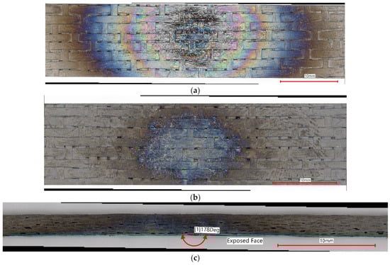 Figure 9 shows optical photographs of the front side, back side and edge of the HNS-CVI composite after the five-cycle thermo-cycle iteration. There is some oxidation and material removal on the front face of the specimen (Figure 9a). The oxidation due to the higher temperature condition in the center of the flame on the back side is also obvious from the discoloration of the specimen (Figure 9b). Interestingly, it was observed that the specimen itself “bent” due to the force and temperature of the HVOF flame. There was a 2° bow in the specimen (Figure 9c) at the center where the flame impinged on the specimen due to the applied bending load from the flame and creep and/or microcracking of the specimen. This is of some concern and may require some backside support or thicker specimens.
