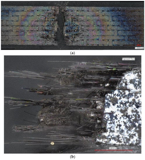 Optical micrographs of (a) both sides of specimen from the flame-impinged face and (b) edge of the specimen showing significant fiber pull-out. Note the speckle pattern in (b) was used for strain measure (DIC) during room temperature tensile test.