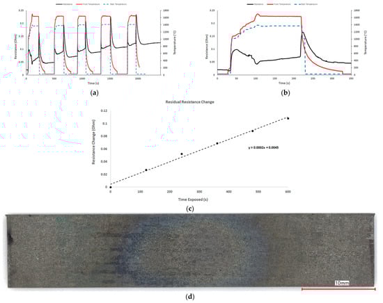 Figure 8 shows some of the details for a burner rig thermo-cycle test for HNS-CVI SiC. The thermal profiles from the FLIR cameras on the front and back sides (Figure 8c,d) were used to determine the max temperature for each side, which are plotted in Figure 8e for the entire test, including cooling. The through-thickness thermal gradient was ~220 °C. Note that the resistance decreases sharply with the sharp increase in temperature demonstrating how sensitive resistivity of SiC is with temperature and that resistance is a good monitor of the test conditions themselves. Upon cooling (turning off the flame), the specimen cools to room temperature and the resistance increases to a value less than what its original pristine value. This is probably because the SiC composites are fabricated at temperatures lower than the thermal exposure and the effect of the higher temperature results in some modification of the microstructure and/or diffusion of atomic species that makes the material slightly more conductive. Additionally, note that upon subsequent thermo-cycle iterations, the residual resistance (Figure 8f) increases slightly with each cycle, especially the latter two cycles. This may be indicative of material removal or damage due to HVOF exposure.