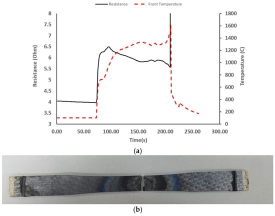 (a) Front side temperature and electrical resistance during heat up of SA-MI specimen and (b) optical micrograph of both halves of SA-MI specimen fractured while heating.