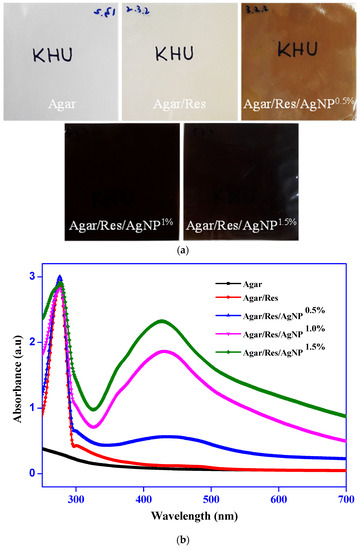 The light absorption spectra of the agar-based films are shown in Figure 1b. The neat agar film did not show any specific light absorption. However, the agar film showed a strong light absorption peak at 280 nm due to UV absorption by the phenolic compound of resorcinol [28,40]. On the other hand, the Agar/Res/AgNP films exhibited another unique light absorption peak around 430–440 nm, which is characteristic of AgNPs [41]. In addition, the peak intensity increased significantly with increasing AgNP concentration. This peak is attributed to the surface plasmon resonance (SPR) transition of AgNPs, confirming that AgNPs were successfully prepared by resorcinol [42]. Similarly, Ahmed, Saifullah, Ahmad, Swami, and Ikram (2016) also confirmed the formation of AgNPs using Azadirachta indica aqueous leaf extract [43].