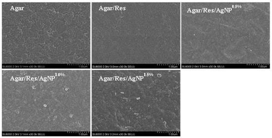 The microstructure results are shown in Figure 2. The neat agar and Agar/Res composite films showed a smooth, dense surface without pores and cracks. The Agar/Res/AgNP composite films showed an even distribution of AgNPs in the polymer matrix; however, some aggregation of AgNPs was observed when large amounts of AgNPs (1.5 wt%) were incorporated. A similar morphology was also observed in carrageen-based films with AgNPs [46].