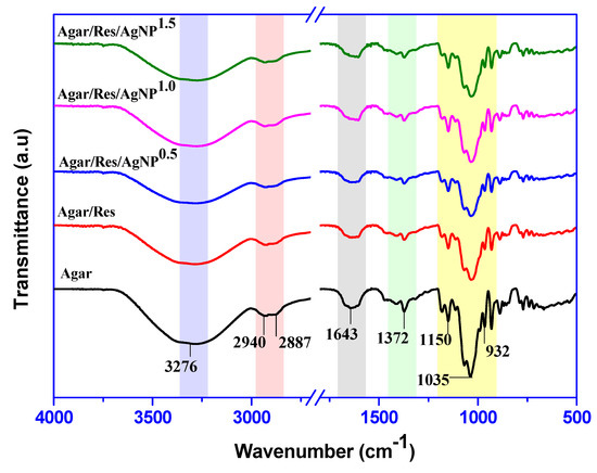 The FTIR spectra of the films are shown in Figure 3. A broad absorption band of 3276 cm−1 was found in all films due to the hydroxyl group’s stretching vibration [47]. The peaks at 2940 and 2887 cm−1 were due to the C–H stretching [33]. The peak at 1651 cm−1 was ascribed to the stretching vibration of the conjugated peptide bond [48]. The peak at 1372 cm−1 was attributed to an ester sulfate group [49]. The film showed characteristic absorption peaks at 1035 and 932 cm−1, ascribed to the C=O stretching group of 3,6-anhydro-D-galactose [50]. Similar characteristic absorption peaks were observed for the Agar/Res and Agar/Res/AgNP composite films for the neat agar film, suggesting no new chemical bonds were created between the agar, resorcinol, and AgNPs. The main interactions in these composite films are probably physical interactions, such as H bonding and van der Waals forces [51].
