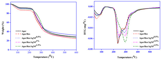 The thermograms of the films are shown in Figure 4. The first weight loss of the films occurred in the range of 60–120 °C with a maximum of around 90 °C due to the evaporation of moisture. The second weight loss was observed in the range of 230–360 °C due to the thermal decomposition of glycerol and polymer matrix [56]. The DTG thermograms showed two different maximum decomposition temperatures: 233–244 °C for glycerol decomposition and 293–299 °C for polymer decomposition. The glycerol decomposition temperature of the agar film was slightly increased by AgNP addition, and the glycerol decomposition peak almost disappeared when 1.5 wt% of AgNPs was added. On the other hand, the polymer decomposition peak was not clear in the neat agar film. Still, the peak became more distinct when AgNPs were added, and the maximum decomposition temperature increased as the AgNP concentration increased. These results indicate that the addition of AgNPs increased the thermal stability of the agar film. This increase in thermal stability may be related to the crystal structure of AgNPs because more energy is required to break down films with high crystallinity [57,58]. Davidović et al. (2019) also reported an increase in the thermal stability of agar-based films by adding AgNPs and magnesium ions [36]. At 600 °C, the residual char content of the film was ~25–32%.