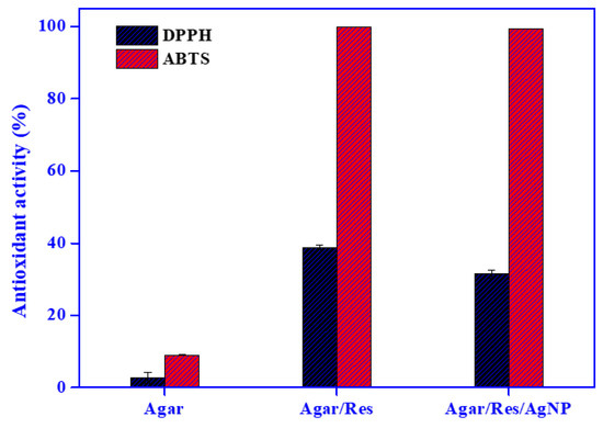 The antioxidant activity results are shown in Figure 5. The neat agar film showed negligible antioxidant activity in the DPPH assay and some antioxidant activity in the ABTS assay. The antioxidant activity of the neat agar film was due to the sulfate group of the agar [59,60]. Current observations on the antioxidant activity of agar-based films are similar to previously published results [46]. Yet, the antioxidant activity of agar film was pointedly amplified when resorcinol was added. The Agar/Res film exhibited ABTS radical scavenging activity of 99% and DPPH radical scavenging activity of 38%. The higher antioxidant activity in the ABTS method than in the DPPH method was due to the different solvent systems used in the analysis, namely an aqueous solution of the former method and a methanol solution of the latter method [61]. However, AgNP addition did not affect the antioxidant activity of the composite film (Agar/Res/AgNP film), but rather a slight decrease in antioxidant activity was observed compared to the Agar/Res film. These results indicate that the antioxidant activity of the composite film comes mainly from resorcinol. The antioxidant activity of resorcinol-added films is due to the phenolic components existing in resorcinol acting as potent hydrogen donors [62,63]. Since the phenolic compound is water-soluble, the antioxidant activity of the resorcinol-containing film was greater in the ABTS method than in the DPPH method.