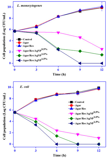 The antimicrobial activity results are shown in Figure 6. The neat agar film and Agar/Res film did not show any antimicrobial activity against Gram-positive and Gram-negative bacteria, showing growth similar to that of the control group. However, AgNP-added films showed significant antimicrobial activity against all test bacteria. The antimicrobial activity depended on the concentration of AgNPs present in the agar-based films. These results indicate that the antimicrobial activity of the composite film comes mainly from AgNPs. In addition, the antimicrobial activity of the Agar/Res/AgNP composite film was greater against E. coli (Gram-negative) than against L. monocytogenes (Gram-positive). Agar/Res/AgNP composite films containing 1.5 wt% AgNPs inhibited E. coli completely at 6 h incubation, but stopped the growth of L. monocytogenes at 9 h. The difference in antimicrobial activity of AgNPs between the test bacteria is mainly due to the difference in the thickness and structure of the cell wall of Gram-positive and Gram-negative bacteria [64]. The thin peptidoglycan layer of Gram-negative bacteria facilitates the penetration of AgNPs than Gram-positive bacteria with thick cell wall structures, making them more susceptible to AgNPs [65]. Similar antimicrobial activity has been observed in AgNP-incorporated carrageenan films [16].
