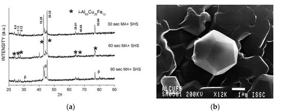X-ray diffraction (XRD) patterns of the products of self-propagating high-temperature synthesis in a Al-Cu-Fe powder mixture, indicating the formation of Al63Cu25Fe12 quasicrystals, the time of HEBM (or mechanical activation, abbreviated as MA in the image) was 30, 60 or 90 s (a). Morphology of the synthesized quasicrystals, secondary electron (SE) image (b). Reprinted from [21], Copyright (2007), with permission from Elsevier.