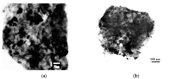 HEBM ternary mixtures can serve as precursors of metal-ceramic composites when the interaction between the two reactants results in the formation of particles distributed in a matrix (the third component of the mixture) [26,27,28]. Figure 3 shows transmission electron microscopy (TEM) images of the Ti-B-Cu mixture subjected to HEBM and the product of SHS (TiB2-Cu), which was additionally milled to reduce its particle size. Both powders are nanostructured. The TiB2-Cu powders were used to produce bulk nanocomposite materials by shock wave consolidation [29] and spark plasma sintering (SPS) [26,27,30].