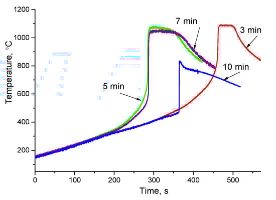 When the synthesis occurs in TE mode, the reaction is initiated in the system over its entire volume. A series of studies have been conducted to analyze the effect of HEBM on the parameters of TE of mixtures of different compositions [31,32,33,34,35,36,37,38,39]. It was shown that the duration of HEBM of the reaction mixtures influences the ignition temperature Tign and the maximum temperature Tmax of TE.