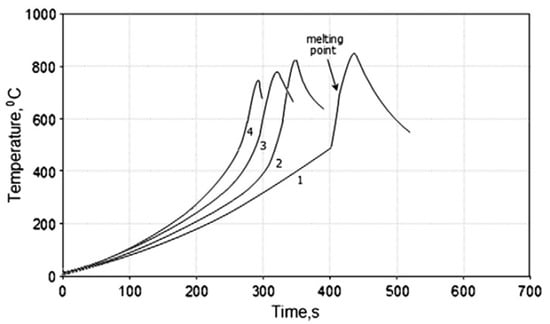 Thermograms of thermal explosion (TE) of a HEBM 3Ti+Al mixture. 1—1 min; 2—3 min; 3—5 min; 4—7 min of HEBM. Reprinted from [34], Copyright (2012), with permission from Elsevier.
