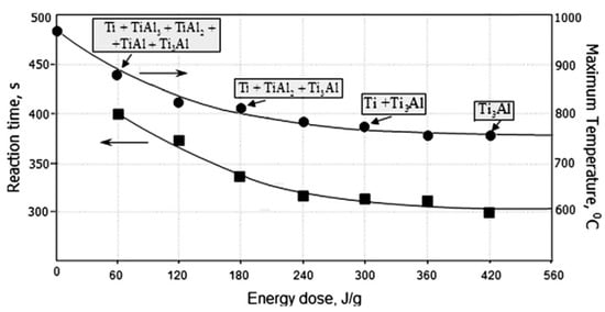 The influence of the duration of HEBM of a 3Ti+Al powder mixture on the phase composition of the TE products and the parameters of TE was studied in ref. [34]. TEM studies showed that the size of metallic particles in the mixture HEBM for 6 min is below 100 nm. The thermograms of TE of mixtures milled for (60 J g−1), 3 min (180 J g−1), 5 min (300 J g−1) and 7 min (420 J g−1) obtained at a heating rate of 50 K min−1 are shown in Figure 7. The input energy given above is used to plot the graphs in Figure 8. The time to reach the maximum temperature was taken as the reaction time. It is seen that the composition of the products of TE, the reaction time and Tmax depend on the milling duration. It was suggested that the concentrations of defects in the crystalline structures and internal stress gradients increase with the milling time causing the observed differences in the behavior of the mixtures upon TE.