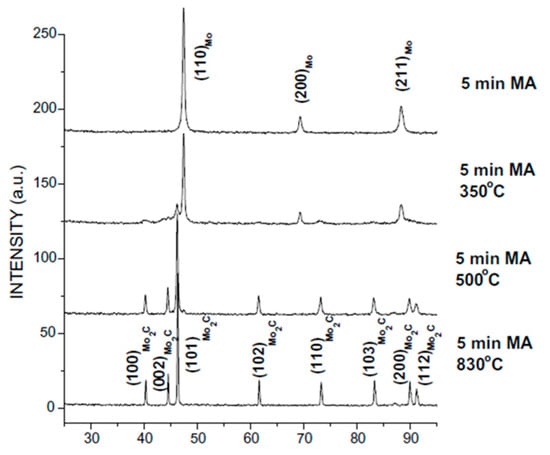 XRD patterns (Co Kα irradiation) of molybdenum–amorphous carbon mixtures after HEBM for 5 min and annealing at 350, 500 and 830 °C. Reprinted from [41], Copyright (2004), with permission from Elsevier.