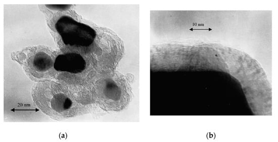 (a) TEM image of the encapsulated molybdenum carbide, Mo2C, particles formed during annealing of a HEBM molybdenum–amorphous carbon 1.5Mo-C mixture. (b) HREM image of the surface of molybdenum carbide, Mo2C, particles encapsulated by polyaromatic carbon formed during annealing of the HEBM 1.5Mo-C mixture. Reprinted from [41], Copyright (2004), with permission from Elsevier.