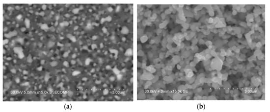 In our studies, we have shown that the SPS behavior of the powder depends on the morphology of the particles [51]. As long as the shape of the particles does not change significantly upon the application of pressure, the contact area between the spherical particles remains small. Particles of platelet shape contact each other over a large area. When sintered by SPS, particles of a Ti-C-3Cu HEBM mixture with a shape close to spherical melted at the contacts [51]. It was shown that the contributions of a passing electric current (energy input by electric current) and the enthalpy of a chemical reaction to the structure formation of a material formed by reactive SPS can be “separated” [38]. This is done via conducting annealing/TE experiments outside the SPS chamber. In [38], the melting effect was not due to the heat of reaction but due to the passage of electric current through the contacts of small size. Figure 11 shows the microstructure of composites obtained from a Ti-C (carbon black)-3Cu non-milled powder mixture and a HEBM mixture of the same composition. The HEBM mixture consisted of nearly equiaxed composite particles. It is seen that the compact produced from the non-milled mixture contains agglomerates of TiC (dark regions in the image of Figure 11a). The microstructure of the composite sintered from the HEBM mixture is quite different: the copper matrix melts locally (bright regions), namely, at the inter-particle contacts (Figure 11b), while TiC particles are of the submicron size and do not form agglomerates [38].