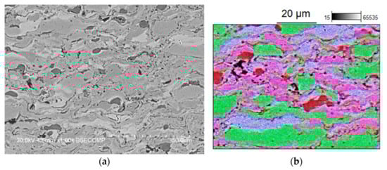 Microstructure (BSE image) of the Fe-Co-Ni-Cu detonation coating (a), maps of the elements overlapping an image (b). Color in (b): red—Fe, purple—Co, green—Ni, blue—Cu. Reprinted from [67], Copyright (2021), with permission from Elsevier.