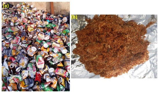 The materials and the method used for the production of samples in this experiment are those of Omoniyi et al. [2], where aluminum waste cans were recycled with wood residue made of hardwood (Mahogany) as reinforcement. The theoretical density of the aluminum alloy is 2.7 g/cm3, and the particle sizes of the wood residue range from 75–125 µm. The chemical composition of the wood particles (WP) and scrap aluminum cans are presented in Table 1 and Table 2. Figure 1a,b shows the materials used for the composite.