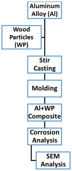 The stir casting technique was adopted in the production of the composite material. The aluminum alloy was placed in a crucible and charged into a furnace preheated to 500 °C. The temperature in the furnace was further increased to 800 °C for 45 min to let the aluminum alloy melt completely. The crucible was brought out of the furnace to remove impurities and slags, and then the wood particles (WP) ranging from 75–125 µm were charged into the crucible. The composite was returned to the furnace and stirred for 20 min at 450 rpm. The composite was then poured into a prepared mold and allowed to cool at room temperature. Figure 2 shows the process route to produce the aluminum composite. Additionally, the experimental matrix is presented in Table 3.