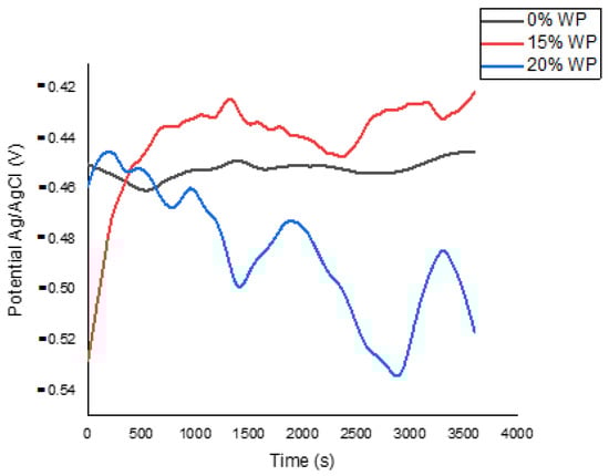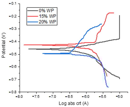 Figure 3 shows the open circuit potential (OCP) plot, which is the potential in the composite material when no current is applied in the system [24,25]. From the plot, each sample shows variations in potential with respect to exposure time, which could result from pores and inhomogeneity, as explained by Yadav et al. [26]. It could further be attributed to simultaneous corrosion product formation and breakdown, described by Alaneme and Olubambi [19]. The unreinforced aluminum alloy had the most stable OCP value, indicating more thermodynamic stability than the other samples. In contrast, 20% wood particle addition had the least stable OCP values, indicating the possibility of it being the most thermodynamically unstable and being able to corrode faster than other samples, which could be a result of the inhomogeneity of the composite. The downward trend of the OCP of the 20% wood particle addition could also be attributed to the loss of passivity due to the thinning of the oxide layer of aluminum oxide (Al2O3), whereas the upward trend of the addition of 15% wood particles until about 600 s could be due to the repassivation of the oxide layer protecting the surface of the composite. Generally, the fluctuations of the OCP values through the period of 1800 s could be further due to incessant passivation and repassivation as a result of the exposure of the composites to a corrosive environment [27].