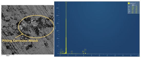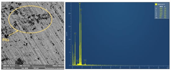 Figure 5, Figure 6 and Figure 7 show the composites’ scanning electron micrographs (SEM). The observations show clusters of Pitt corrosion attacks on the surface of each sample after exposure to the 3.5% wt NaCl solution. The formation of pits on the surface of the samples further shows that the passive film (Al2O3) formed against corrosion attack was not enough to sustain the effect of the halide ions (Cl−) [21,23,30]. It could also be due to inclusions and intermetallic formed within the composites [18,26]. From the EDS charts, the presence of oxygen (O), chlorine, sodium, and carbon in the composites suggested the formation of aluminum carbide, which Alaneme et al. [31] explained is responsible for the adverse effect of corrosion in aluminum composites. However, the presence of silicon carbide from the wood particles was not sufficient to mitigate the effect of the Al4C3 formation in the composite. The reaction of aluminum and carbon is presented in Equation (1). Furthermore, the reaction of aluminum with the chloride ions (Cl−) generated from the dissolution of sodium chloride (NaCl) in water to form aluminum chloride (AlCl3), which results in pitting corrosion on the metal surface, is presented in Equation (2) [32].