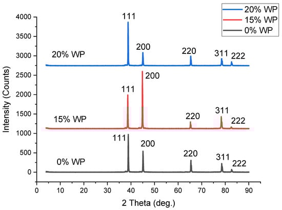 Figure 8 shows the X-ray diffraction (XRD) analysis done on the composites to establish the phase and existence of reinforcement in the samples. The prominent crystal planes observed are Al (111) and Al (200), of which (111) is more prominent, except for that of 15% wood particle addition. The phases confirm the face-centered cubic (FCC) nature of the crystals. The phases were consistent for all samples, which denotes that no new phase was developed during the manufacturing process due to the wood particles getting burnt as volatile matter during the manufacturing process or the fraction volume of the wood particles being small and undetectable by XRD, except for the 20% wood particle addition sample, where traces of aluminum carbide were detected. The peaks verified the existence of aluminum, as also observed by El-Fattah et al. [22] and Ikubanni et al. [33], where eggshell was used as reinforcement for aluminum.