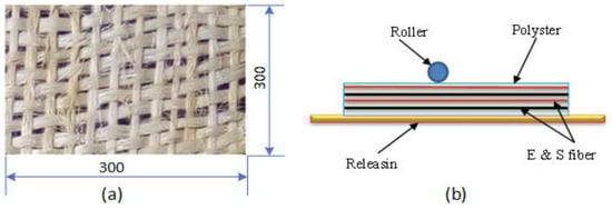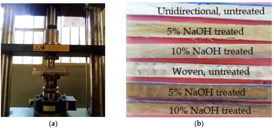 Fibers from both enset and sisal were extracted, dried, washed, and alkali-treated. The composites were prepared using the hand lay-up method. The sample was fabricated in the following dimension (300 × 300 × 5) mm on steel sheet plate. The composite samples were prepared at room temperature for untreated, 5%, and 10% NaOH with woven and unidirectional orientations, as shown in Figure 1a,b. The resin and hardener, in the ratio 10:1, were prepared and poured onto the mold surface. A roller was used to distribute the resin and again spread polyester and fiber, and this was repeated until the required lamina existed [24]. Then, the samples were compressed with a 30 kg load for 24 h, to ensure that the polyester resin had penetrated the porosity of the fibers and samples. To ensure matrix and reinforcement strength, the sample was cured for 48 h. After the curing process, test samples were cut to the required standards.
