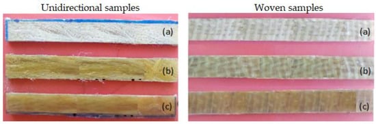 Unidirectional (L) and woven orientation (R) types of (a) untreated; (b) 5% NaOH-treated; and (c) 10% NaOH-treated E/S hybrid composites.