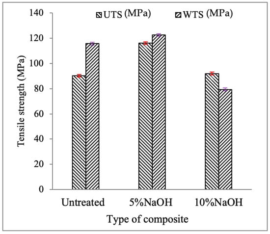 As shown in Figure 4, a 5% NaOH-treated fiber hybrid composite has a higher tensile strength than an untreated or a 10% treated fiber hybrid composite. This is due to the lack of removal of impurities from the fibers, which causes weak fiber matrix interfaces and a greater optimal condition for delignification, which causes weakening and damage to the fibers [13]. The 5% NaOH result demonstrates better tensile strength in both fiber-oriented composites. As the untreated (control) fibers have impurities that can affect the fiber-matrix interface and higher alkali concentrations (10% NaOH) can damage the fibers, the optimal setting for eliminating impurities from fibers is a 5% NaOH treatment. The woven types of fiber-orientation composites have higher tensile strengths than unidirectional fiber-orientation composites in the cases of untreated, 5%, and 10% NaOH-treated. The tensile strength of 5% NaOH-treated woven was improved by 5.2% compared with untreated enset/sisal composites. Low tensile strength due to poor adhesion between the matrix and the reinforcement.