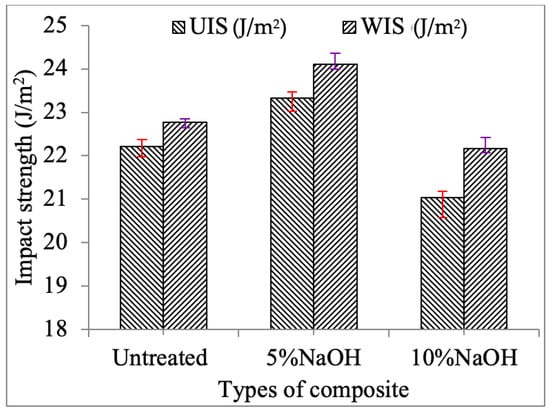 Although a strong binding must be guaranteed to produce materials for interior and structural applications, a weak interfacial link increases toughness by encouraging pullout effects required for energy absorption or impact strength purposes. For this reason, the 5% NaOH-treated composite has greater impact strength than the 10% NaOH-treated and untreated hybrid composites.