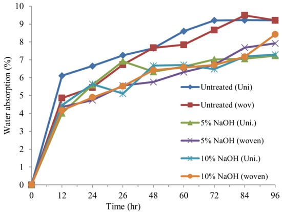 As illustrated by the plots in Figure 7, all composites have the same water absorption characteristics, which implies that during the first 12 h, the range of water absorption varied from 5% to 6%. Then it climbed from 6.5% to 9% after 48 and 72 h and remained mostly unchanged after 84 h. When used as reinforcement in composite materials, the fiber’s expansion upon water absorption would cause microcracks in the material, which would damage its mechanical qualities [28]. One can only draw the conclusion that fiber orientation, fiber treatment, and matrix compatibility can help natural fiber composites absorb less water. Compared to untreated fiber composites, treated fiber composites absorb less water, while treated woven composites absorb less water than treated unidirectional composites. Compared to untreated fiber composites, treated fiber composites absorb less water. On the other hand, treated unidirectional composite absorbs less water than treated weaved composite. This shows that better fiber-matrix compatibility leads to improved mechanical and water absorption properties.