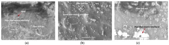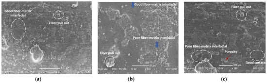 SEM image of unidirectional enset/sisal hybrid composite (a) untreated; (b) 5% NaOH-treated; and (c) 10% NaOH-treated.