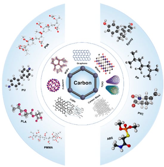 Based on the dimensions of dispersed carbon nanomaterials, there are three primary types of polymer nanocomposites. The first type of carbon-based nanofillers is two-dimensional (2D) reinforced nanomaterials, including reduced graphene oxide (rGO) and MXenes []. Graphene and MXene sheets are a few nanometers thick, whereas carbon-based nanofillers of other dimensions are much thicker. The second class of carbon-based nanofillers is one-dimensional (1D) reinforced carbon nanotubes (CNTs), including different types, e.g., single-walled carbon nanotubes (SWCNTs) and multi-walled carbon nanotubes (MWCNTs). These 1D nanofillers are employed as nano-reinforcing materials in polymer matrices to achieve better characteristics of nanocomposites []. The third group of carbon-based nanomaterials is zero-dimensional (0D), including carbon quantum dots (CQDs), fullerene, and carbon black, which offer different particle shapes. Due to their small size and tunable structural properties, these nano-reinforcements are emerging as a means of obtaining nanocomposites with exceptional properties [,]. Another class of carbon-based nanomaterials is metal–organic frameworks (MOFs), which have no specific dimensions. The structures of all carbon-based nanofillers, including graphene, MXenes, CNTs, CB, CQDs, fullerene, and MOFs, are shown in Figure 1.
