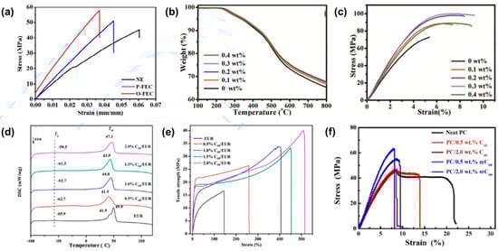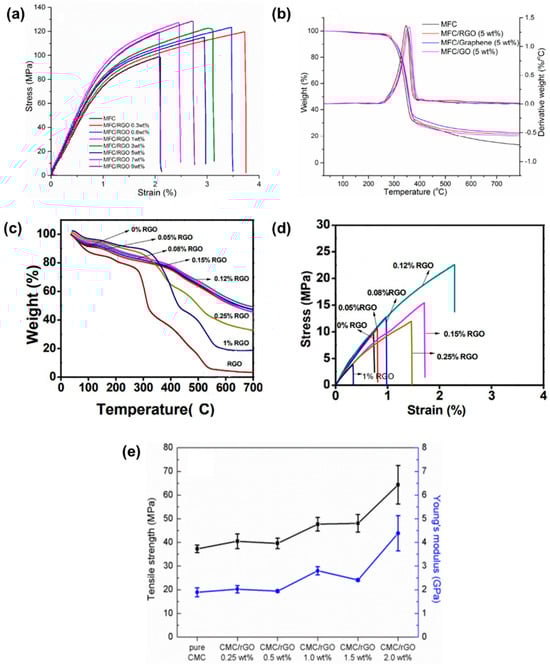 (a) The stress–strain curves and (b) thermal degradation of nanocomposites []. (c) Thermal resistance and (d) mechanical properties of PF/rGO nanocomposites [] (e) Tensile strength and Young’s modulus of CMC/rGO [].