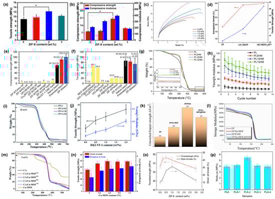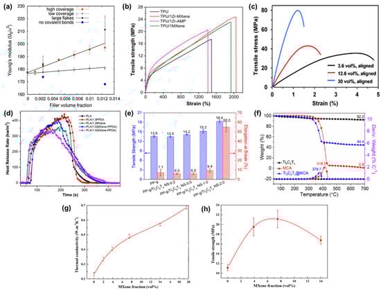 The mechanical properties of MXene–based nanocomposites: (a) Young’s modulus of MXene–epoxy nanocomposite with different loadings of MXene [], (b) tensile strength of MXene–TPU nanocomposites [], (c) stress–strain curve of MXene–epoxy-based nanocomposite []. (d) Thermal stability of PlA/MXene nanocomposites []. (e) The tensile strength and elongation of pP/MXene nanocomposites []. Thermal properties of (f) TPU/Ti3C2Tx@MCA [], (g) thermal conductivity with varying MXene contents []. (h) Tensile strength with different loadings of MXene [].