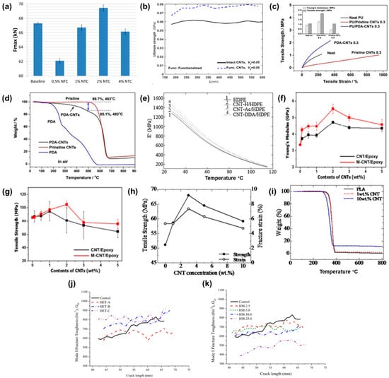 Mechanical properties: (a) strength of CNT-epoxy-based CFRPC at various loadings of CNTs [], (b) ultimate strength of functionalized CNT-based polymer composites [], (c) stress–strain curves of pure PU, PU/CNTs, and PU/PDA-CNTs []. (d) Thermal properties of pure PU/CNTs and PU/PDA-CNTs []. (e) Storage modulus of CNT-based polymer composite []. Mechanical properties of CNTs/epoxy: (f) Young’s modulus and (g) tensile strength []. (h) The tensile strength and fracture strain and (i) TGA of pure PLA and PLA/CNTs []. Mode I fracture toughness of CNT-based polymer composites (j) for homogeneous dispersion and (k) for heterogeneous dispersion [].
