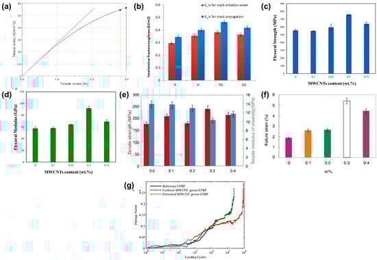 The mechanical properties of MWCNT-reinforced polymer composites: (a) stress–strain curves of MWCNTs/PMMA [], (b) interlaminar fracture toughness of MWCNT-reinforced CFRPs [], (c) flexural strength of MWCNTs/epoxy [], (d) flexural modulus of MWCNTs/epoxy [], (e) tensile properties of MWCNT-reinforced GFRPs [], (f) failure strain of MWCNT-reinforced GFRPs at different concentrations of MWCNTs as represented by different colors [], and (g) tension–tension fatigue loading of MWCNT-reinforced CFRP [].