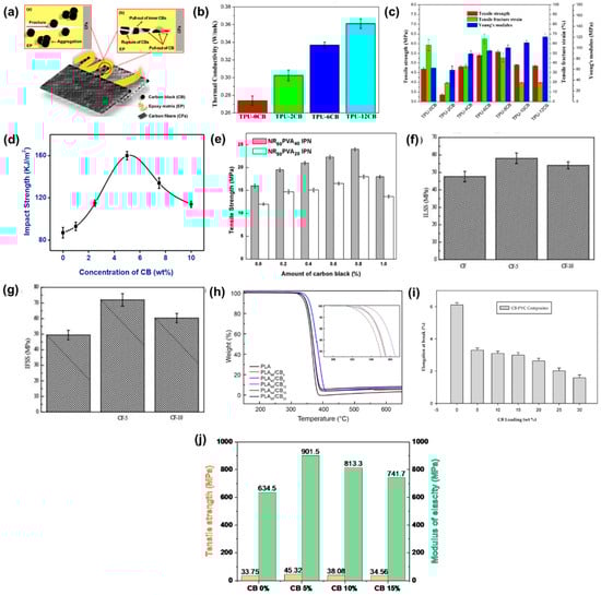 (a) Schematic representation of the mechanical interlocking mechanism of CB/epoxy [], (b) thermal conductivity of TPU/CB composites [], (c) tensile properties of TPU/CB at various loadings of CB [], (d) impact strength of PP/CB [], (e) tensile strength of PVA/NR/CB with various loadings CB []. Mechanical properties of CB-reinforced CFRPC: (f) ILSS and (g) IFSS []. (h) Thermal properties of PLA/CB with different contents of CB [], (i) elongation of CB/PVC at various loadings of CB [], and (j) illustrations of the tensile strength and modulus of elasticity of CB-reinforced epoxy composites [].