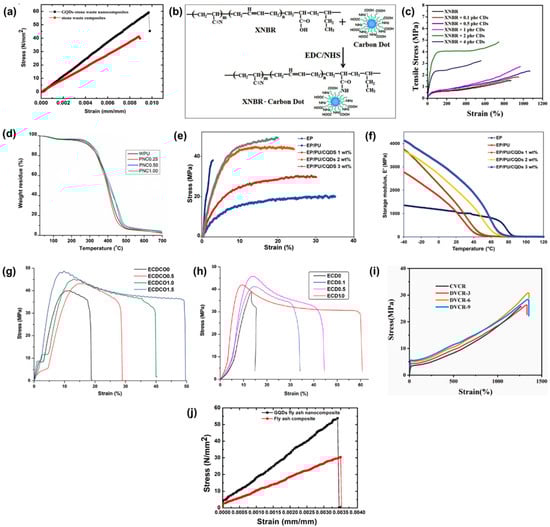 (a) Stress–strain curves of stone waste composite and CQD-reinforced stone waste nanocomposite [], (b) stepwise fabrication of XNBR/CQD nanocomposite [], (c) stress–strain curves of XNBR/CQDs with various loadings of CQDs [], (d) thermal stability of pure WPU and WPU/CQD nanocomposites []. Mechanical properties of EP, EP/PU, and EP/PU/CQI (e) stress–strain curves and (f) storage modulus []. Stress–strain curves of epoxy/CQD nanocomposite with different contents of CQDs: (g) 0 to 1.5% [] and (h) 0 to 1% []. (i) Stress–strain curves of pure CR and CR/CQDs [], (j) stress–strain curves of fly ash/epoxy and fly ash/epoxy/CQDs nanocomposite [].