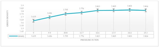 Figure 3 depicts that the green density increased as the pressure rose, which was due to a decrease in pores as the compacting pressure increased. The rearrangement of the powder will occur when pressure is applied, resulting in localized deformation. An increase in pressure leads to the removal of gaps or spaces between the particles and the formation of new contacts, and eventually, a homogeneous deformation of the highly condensed sample occurs.