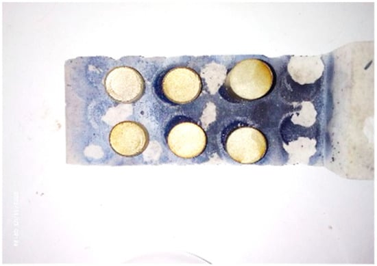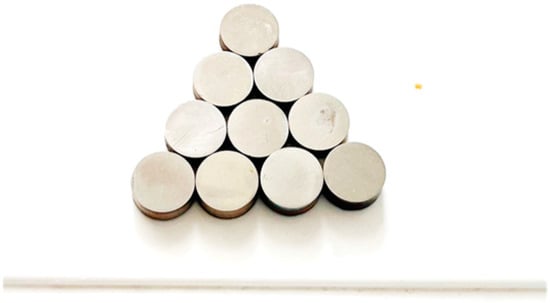 On a grinding machine (type: Mekton, UK), the samples of manufactured sintered compacts were wet ground with silicon carbide emery papers of 400, 800, 1500, 2000, and 3000 µm grit. Thereafter, a constant period of time equal to 15 min was fixed for the overall grinding period for every sample’s surface preparation for necessary tests and examinations. They were then washed in distilled water and dried for 30 min in an electric vacuum oven at 125 °C. Next, the samples were organized into categories for subsequent examinations and tests []. The samples after sintering are shown in Figure 6.