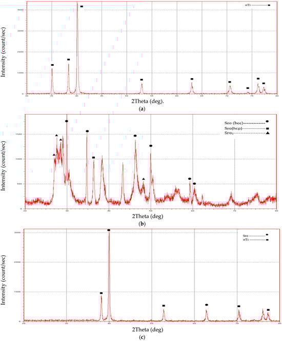 Numerous studies have shown that modifying surfaces with inorganic metal elements such as zinc (Zn), magnesium (Mg), and strontium (Sr) can hasten osseointegration and encourage the formation of new bones []. As a result, ceramic oxides or metallic dispersions are used as reinforcing agents []. Sr is thought to have multiple action mechanisms. One strontium compound, Sr ranelate, is a combination of sodium ranelate and strontium chloride (SrCl2·6H2O). Numerous works have demonstrated that Sr can stimulate the calcium-sensing receptor (Ca SR) found in the membrane of osteoclasts and osteoblasts, which proposes that it plays an important role in the anabolic effects of Sr on osteoblast cells. Sr is an intriguing candidate for a surface coating because of its mentioned features, given that it can combine the mechanical characteristics of a Ti-based implant with a relatively rough surface []. Sr oxide influences bone production and resorption by promoting osteoblast survival and differentiation. Preosteoclast differentiation was also observed to be decreased concurrently by SrO []. SrO is an intriguing choice for a surface coating because of its mentioned features, considering that it can combine the mechanical capabilities of Ti-based implants with a surface that is only moderately rough with the benefits of Sr for the repair of bones. Sr can inhibit the osteoclast differentiation of preosteoclast cells and promote the expression of outcome cells and protein secretion to stimulate bone repair []. Also, these compounds have a high hardness and are highly coherent to the base, improving the physical and mechanical properties of base alloys [].
