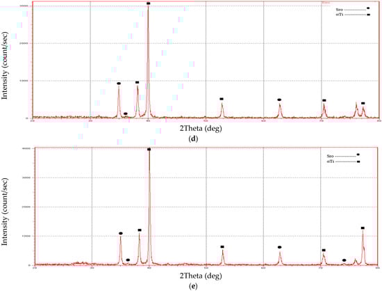 Figure 7a displays the X-ray diffraction (XRD) results for the cp Ti composites without adding SrO. Here, ⍺-Ti phases developed in the Ti composites structure that had been sintered at 1000 ± 3 °C under argon gas, which was indexed by standard cards (JCPDS-ICDD 44–1288 and 29–1360(Ti) card number: 44.1294; JCPDS-ICDD 44–1288 and 29–1360(SrO) card number: 06.0520) that were represented by JCPDS-ICDD 44–1288 and 29. The XRD results for the strontium oxides (SrO(hcp), SrO (bcc), and SrO2) are shown in Figure 7b. Following the sintering process at 1000 ± 3 °C with argon gas, Figure 7c–e shows the XRD patterns for the cp Ti-SrO alloys at various percentages (2%, 4%, and 6% by wt%). The peak position of the sintered composite with the 2% SrO addition was between 60° and 70°, and SrO appeared in the diffraction patterns. Therefore, this result is consistent with earlier findings [,]. The diffraction patterns and peak positions with the 4% SrO addition between 30° and 40° show that the sintered composite contained extra SrO. Along with 60° to 70°, the diffraction patterns and peak positions show that the sintered composite had more SrO than usual. As shown in Figure 7e, the maximum SrO peaks were observed at their maximum values in the sintered composite diffraction patterns and peak positions with a 6% SrO addition between 30° and 40°, 60° and 70°, and 70° and 80°. This finding indicates that as the SrO percentages increased, the proportion of SrO rose in the composite and reached its maximum. Only the ⍺-Ti phases were formed in the Ti composite and Ti-SrO composite structures at different percentages (2%, 4%, and 6% by wt%), and phase transformation was not observed in the base alloy.