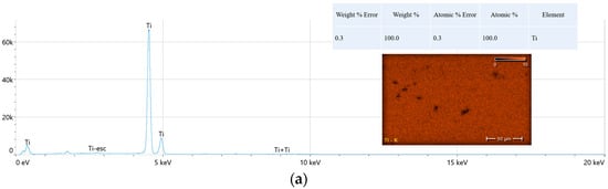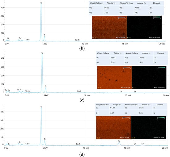 Following the sintering process, the true porosity and density of all used alloys were measured. The porosity increased when the concentration of SrO rose (Table 3, Table 4 and Table 5), as shown in Figure 8. The EDX mapping and chemical determination of the specimens are shown in Figure 9, which shows the EDX for the Ti composite and Ti–2%SrO, Ti–4%SrO, and Ti–6%SrO alloys. The Ti peak was more pronounced than the SrO peak, as expected in the EDX phases. The microstructure and quantification of microstructural data were determined with scanning electron microscopy and energy dispersive X-ray spectroscopy (EDX) for the percentage of specimens sorted by weight, as shown in Figure 8 and Figure 9.