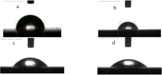 A contact angle goniometer was used to perform water contact angle measurements through the sessile drop method on a contact angle goniometer or tensiometer (an instrument generally called a contact angle goniometer or tensiometer, which is used to measure the static contact angle) at room temperature. A total of the measurements was conducted and averaged for each specimen and then compared with the samples of cp Ti composite as a control (Group A). Water contact angle images were collected for all study groups. The control Group A showed a higher water contact angle of 86.492°, while group B showed a decrease in the water contact angle of 72.485°, followed by group C (60.997°) and group D with the lowest water contact angle of 50.284° (Figure 10). The descriptive statistics, ANOVA, and multiple comparison test (Games–Howell) data analysis are detailed in Table 17, Table 18, Table 19 and Table 20.