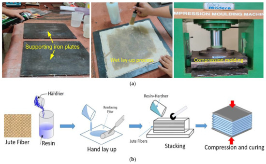 The fiber-reinforced composites were fabricated using the hand layup technique. The matrix material used was general-purpose polyester resin. K6 hardener was used as the hardener material. The ratio of hardener to resin used was 1:10. Woven jute fiber mats were used as the reinforcement material. In this work, for 100 g mixture of resin and jute fibers, the weight of the reinforcement material taken was 35 g, and the remaining 65 g was the resin (35:65 weight ratio). To maintain this desired fiber and resin ratio, the fiber mats were trimmed to the required size before starting the layup process. The downside supporting iron plate (mold) was thoroughly cleaned to get rid of dust and stuck materials, and a wax-based mold-releasing agent was sprayed. Wax-based releasing agents are a mixture of wax, solvents, and other additives. They are easy to apply and provide a good release barrier between the composite material and the mold. Once all these arrangements were made, the first fiber mat was placed with a fiber orientation of 90°, and the resin was added evenly over the mat using a brush. After sufficient resin was added, the roller was passed over to press against the mat and remove air bubbles. This stacking procedure was continued until the composite’s required thickness was obtained. Once the stacking process was over, the releasing agent-coated top iron plate was placed at the top, and the entire mold was wrapped in a polythene sheet. This wrapped composite was placed under the load for a period of 48 for curing purposes. The curing temperature used was 60 °C, and the load applied was 100 kg/cm2. The composite was unwrapped once the curing was over, and excess material from all four sides was trimmed off. The same method was repeated for the preparation of 45° fiber orientation composite. Figure 1a shows actual images of the composite preparation process, and Figure 1b represents a schematic diagram of the specimen preparation process.