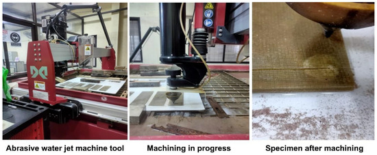 In the wake of growing mass production, the manufacturing sector is constantly looking for technologies that can turn raw materials into useful merchandise with minimal wastage. The requirement has propelled innovations not only in the field of materials and manufacturing but also in machining. The unprecedented use of hard-to-machine materials, such as polymers and their composites, in various advanced engineering applications has necessitated the application of compatible machining methods. Machining fiber-reinforced polymers (FRP) is a challenging task due to the heterogeneous structure of the material [1]. The heterogeneity arises from distinct fiber reinforcements and the polymer matrix material, which widely differ in their mechanical, physical, and thermal properties. Adopting conventional machining processes to machine FRP leads to machining damage such as matrix cracking, fiber pull-out, fiber fracture, burrs, delamination, and debonding [2,3]. Thus, different non-conventional machining processes, such as laser machining [4], electrical discharge machining [5], electro-chemical machining [6], and abrasive water jet machining (AWJM) [7], are used to machine FRP. Amongst numerous non-conventional machining methods, AWJM is considered the ideal method for machining FRP [8].