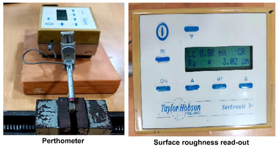 Surface roughness after machining was measured with Taylor Hobson Surtronic 3+ surface roughness measuring instrument. The roughness was measured for both 45° and 90° fiber inclination composites. The average values of three readings measured at various places were considered as final Ra values. The set-up used for the measurement of Ra is presented in Figure 3.