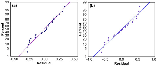 Normal probability plots for data collected for (a) 45° fiber inclination, (b) 90° fiber inclination.