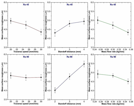 A gradient line in the main effect plots shows how the selected parameters affect performance. The steeper the line, the higher the influence. Accordingly, Figure 5 displays the influence of process variables on the mean Ra value when machining composites have fibers with 45° inclinations. Abrasive MFR displays a steeper slope in comparison to the other two input parameters, indicating a greater impact on surface roughness. A slight variation in the MFR causes surface roughness to change drastically. Hence, while varying the levels of this parameter, one should take the utmost care. It is not recommended to change the level of this parameter from the optimum value. The parameter SOD exhibits a moderate slope, indicating a moderate impact on surface roughness. Hence, a small amount of variation in the level of this parameter can be implemented according to our requirement. By displaying the smaller slope, the parameter TS suggests the least impact. It means that the level of this parameter can be fixed at any value between the chosen ranges. In the case of composites with a 90° fiber orientation, the maximum slope was denoted by SOD, indicating a greater influence. The MFR was moderately influential followed by TS. Therefore, changes in the level of the parameter SOD are not recommended. The parameter MFR can be moderately varied and the parameter TS can be fixed at any level between the selected ranges.
