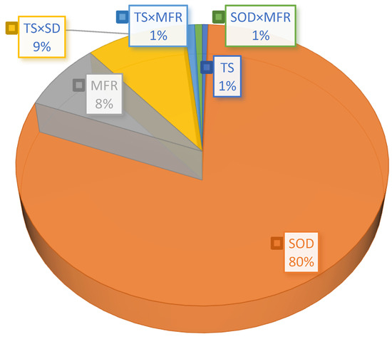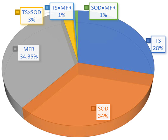 Figure 6 depicts the contribution of each parameter in the generation of surface roughness during the machining process of the 45° fiber inclination specimen. Even though all three considered variables contribute almost at an equal level, MFR is the dominant one. Similarly, Figure 7 represents the percentage contribution of each parameter and the interaction effect on the generation of roughness when the fiber inclination is 90°. It is clear from the figure that SOD has a higher contribution in comparison with other variables.