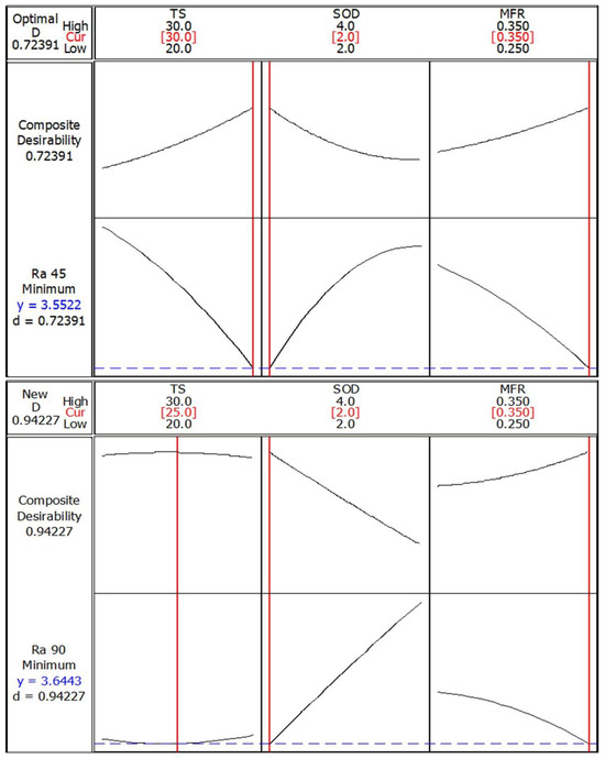 The optimization plots provide an optimum set of levels that should be set for the AWJM process parameters in order to obtain the required output. For this particular work, the Response Surface Methodology (RSM) optimum plot is obtained which provides the optimum level of each AWJM variable in order to obtain the minimum surface roughness. The RSM optimum plots are plotted for both 45° and 90° fiber orientation cases and are shown in Figure 8. According to the plot, for the present experimentation condition, to attain minimum roughness on 45° fiber inclination composites, the optimum combination should be TS = 30 mm/mim, SOD = 2 mm and MFR = 0.35 kg/min. In a similar way, to obtain the minimum roughness on the 90° fiber inclination specimen, the combination should be TS = 25 mm/mim, SOD = 2 mm and MFR = 0.35 mm/min, which is similar to Taguchi optimum combinations.